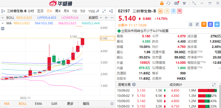 三叶草生物近期股价持续强势,截至发稿,现涨近15%,报5.14港元,成交额1.338亿港元,换手率2.4%。值得关注的是,三叶草生物月内累计涨幅近180%。