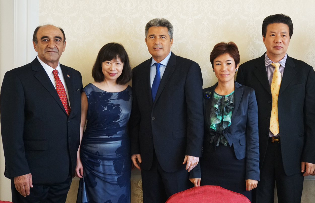 新闻稿附的合影。自左往右:华南美国商会哈利会长,会长夫人孙惠,好莱坞(中国)投资集团董事局主席蒂姆斯·瓦迪亚西贝斯博士,好莱坞(中国)投资集团派拉蒙主题公园大中华区常务副主席黄素庄,广东省福建商会执行会长王诗增先