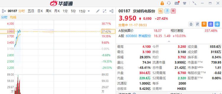京城机电股份(00187)早盘高开近6%,盘中拉升一度涨超30%,截至发稿涨27.42%,成交额超3100万港元。