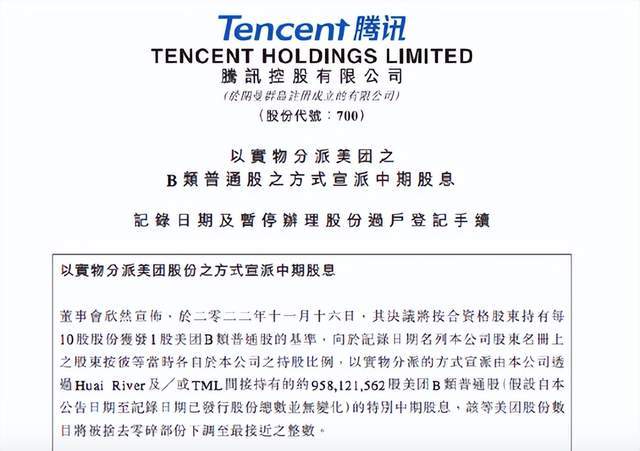 据腾讯发布的公告内容显示,事会决议将按合资格股东持有每10股股份获发1股美团B类普通股的基准,以实物分派的方式宣派由本公司透过Huai River及╱或TML间接持有的约958,121,562股美团B类普通股的特别中期股息。这一操作后,腾讯在美团的持股比例将从17%下降至不足2%。