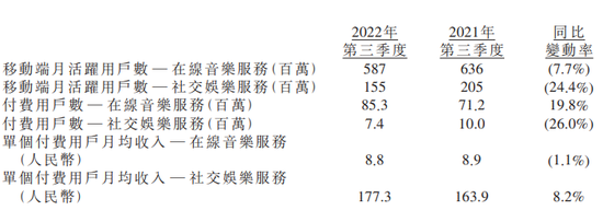 在组成腾讯音乐的两架马车里,社交娱乐是比在线音乐更赚钱也更有想象力的业务。但在三季度财报中,它的月活同比下跌24%,付费用户也同比下降25%。该板块的用户流失,可能直接导致腾讯音乐未来收入空间被挤压。