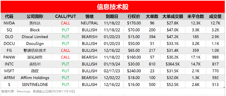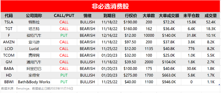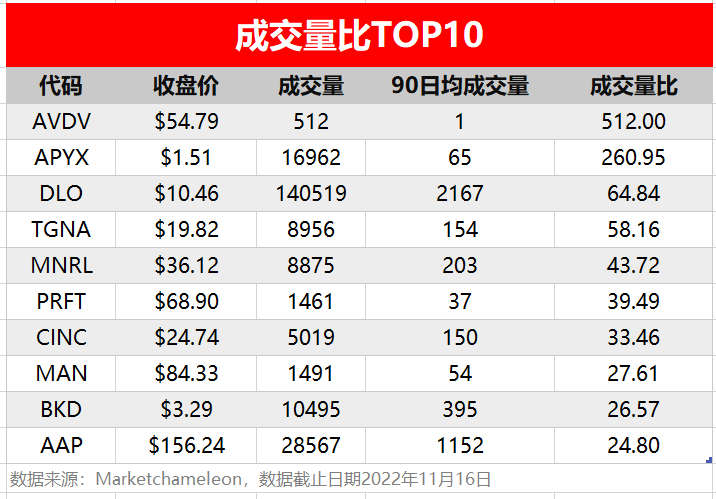 周三(11月16日),非必选消费、信息技术和金融板块相关个股出现较多活跃单,按照当日成交量排行,榜单TOP 10分别如下: