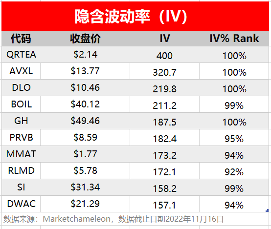 (注:隐含波动率(IV)指标是期权交易最常用的指标之一,通常情况下该指标越高,意味着期权交易的机会越大,IV(%)百分比表示当前隐含波动率在过去一年中最高和最低区间内的相对位置,有助于了解指定期权波动率的纵向趋势,该比率越高说明近期隐含波动率处于上升趋势。)