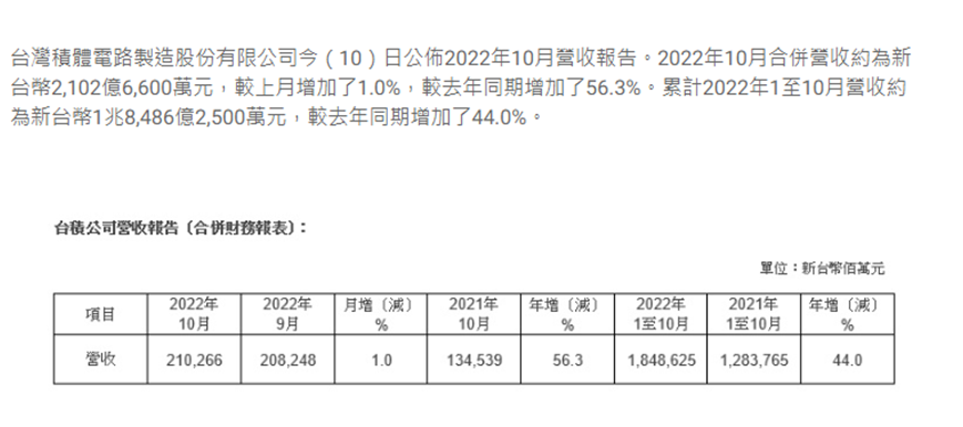 - 公司业绩方面,台积电上周公布的10月营收同比大增56%,公司10月合并营收约为2102.66亿元新台币(约合479.41亿元人民币),较上月增加了1.0%,较去年同期增加了56.3%。此外,台积电上个月公布的第三季度营收超出了市场预期,第三季度总营收202亿美元,同比增长35.9%,环比增长11.4%。毛利率达60.4%,营业利润率达50.6%,均超出市场预期。财报后高盛发布研究报告,重申对该股的“买入”评级,但剔出“确信买入”名单,目标价由126美元降至89美元,以反映盈利前景转弱及需求不确定性上升。
