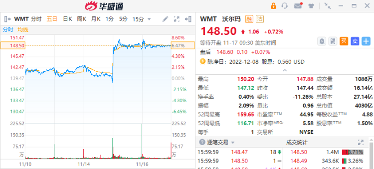 4、2023年业绩指引优于预期,沃尔玛单日涨约7%,获投行看好市场份额继续提升。