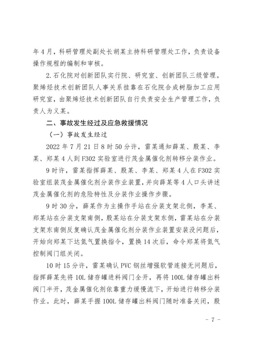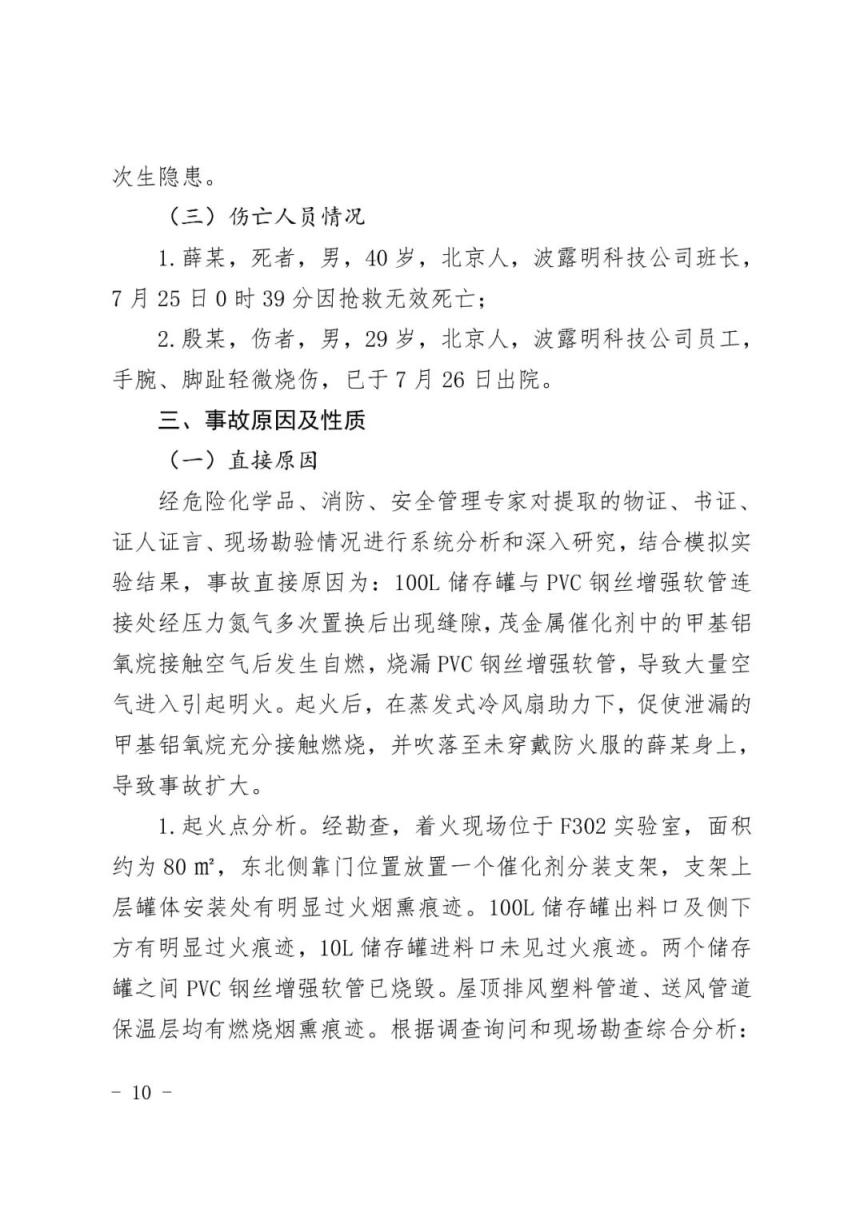 7月21日10时20分许,位于北京市昌平区沙河镇中国石油天然气股份有限公司石油化工研究院F座302实验室,发生一起茂金属催化剂泄漏燃烧事故,造成1人(薛某)死亡,1人(殷某)受伤。