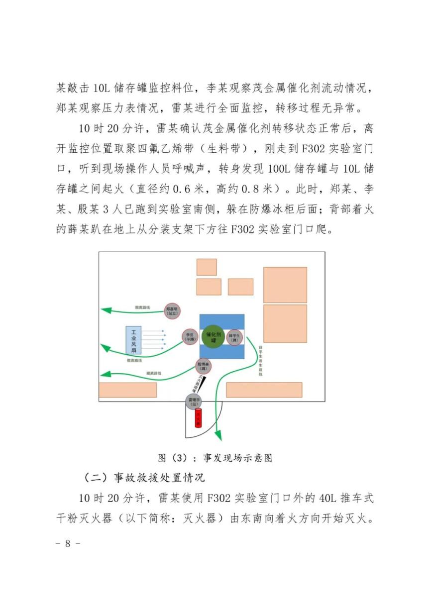 事故直接原因为:100L储存罐与PVC钢丝增强软管连接处经压力氮气多次置换后出现缝隙,茂金属催化剂中的甲基铝氧烷接触空气后发生自燃,烧漏PVC钢丝增强软管,导致大量空气进入引起明火。起火后,在蒸发式冷风扇助力下,促使泄漏的甲基铝氧烷充分接触燃烧,并吹落至未穿戴防火服的薛某身上,导致事故扩大。