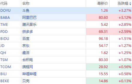 华盛资讯11月17日消息,中概股盘初拉升,乐信涨超13%,雾芯科技涨超10%,亚朵集团涨超9%,斗鱼、阿里巴巴涨超3%,腾讯音乐、拼多多,哔哩哔哩、京东等跟涨。