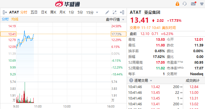 智通财经APP获悉,周四,亚朵(ATAT.US)股价走高,截止发稿,该股涨超17%,报13.41美元,总市值超17.39亿美元。该公司于上周五在美国纳斯达克挂牌上市。