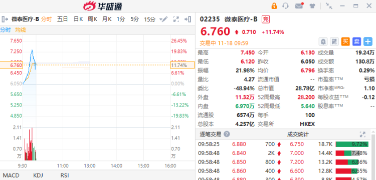 华盛资讯11月18日消息,微泰医疗-B(02235)早盘急升,股价一度涨逾20%,截至发稿,现涨11.74%,报6.76港元。