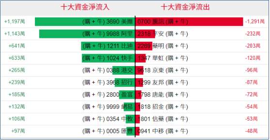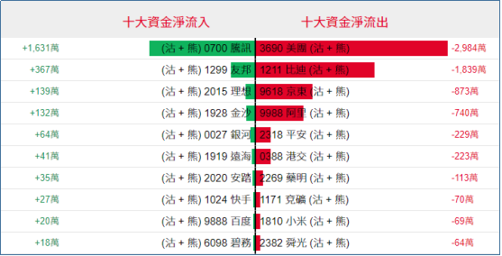 好仓(认购证及牛证)方面,周四美团、阿里相关好仓单日分别录得约1197万港元、1143万港元资金净流入,腾讯等相关好仓单日录得约1291万港元资金净流出套现。
