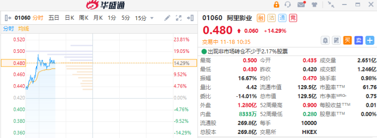 11月18日消息,港股影视娱乐股早盘集体上涨,截至发稿,阿里影业一度涨超15%,腾讯音乐涨近14%,云音乐涨超7%,IMAX中国涨超5%。