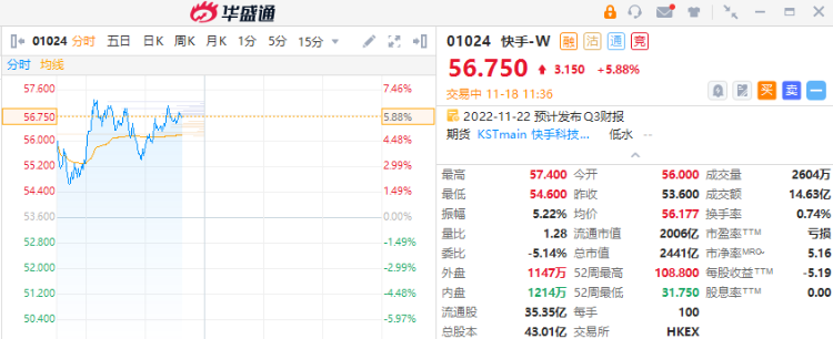 其中部分股份今日早盘走势强劲,快手涨5.88%,金蝶国际涨4.41%,哔哩哔哩涨3.87%,京东健康涨2.35%,华润电力涨1.44%。