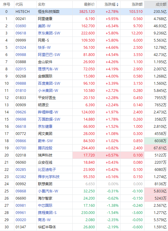 科网股全线上涨,美团涨超6%,京东、网易涨超5%,阿里绩后涨超4%,快手涨逾3%,小米涨超2%。