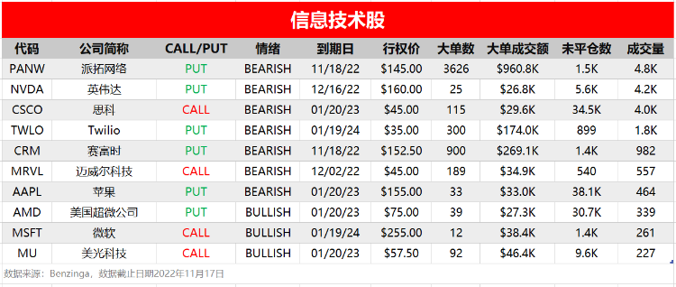 - 派拓网络现11月18日到期、行权价145美元的看跌期权异动大单,成交3626张,总成本96.08万美元。派拓网络期权交易活跃度提升,周四成交11万张,前值8.9万张,远超成交量均值1.8万张。