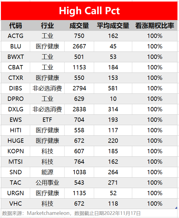 - 当日Call单比率达到100%的个股或ETF达到17只,生物医药公司BLU $BLU 期权成交量升至2667,看涨期权比率100%。本周,RBC Capital分析师认为公司在P2X3领域处于有利地位,维持21美元目标价(周四收盘9.27美元)。