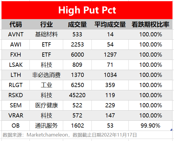 - 当日Put单比率达到100%的个股或ETF有9只,医疗保健基金FXH $FXH 看跌期权成交比率100%,成交量6000张。该ETF前十大持仓股包括MRNA $MRNA 、信诺、辉瑞等。