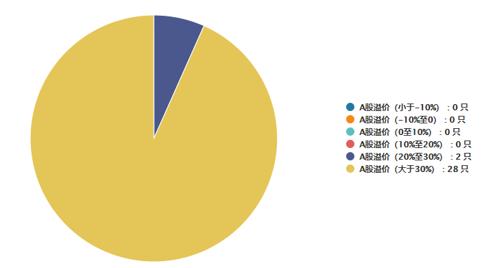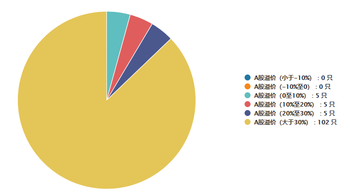 本周有130只A股溢价超过30%,7只溢价在20%至30%之间,5只在溢价10%至20%之间,5只溢价在0-10%之间。