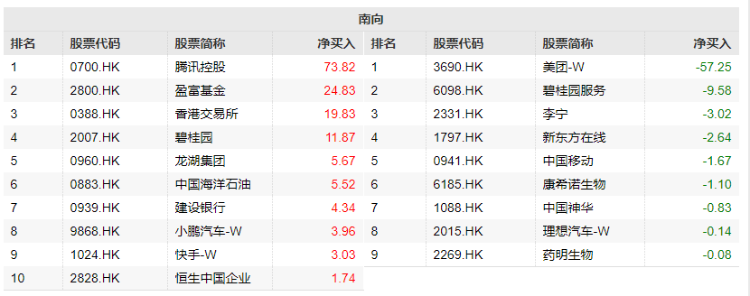 内资近7天加仓腾讯控股73.82亿港元,加仓盈富基金24.83亿港元;抛售美团57.25亿港元;
