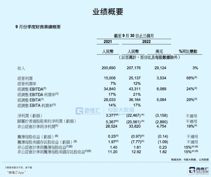 财报数据显示,2023财年第二季度(自然年2022年三季度)业绩,阿里巴巴实现季度收入2071.76亿元人民币,同比增长3%。经调整EBITA同比增长29%至361.64亿元人民币。