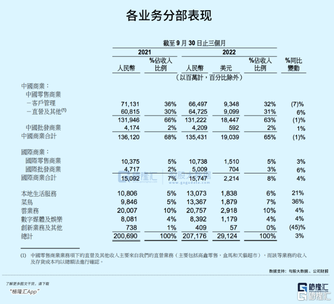从菜鸟方面来看,其业务发展迅速。财报显示,本季度,在抵消分部交易的影响前,菜鸟的收入同比增长26%至182.82亿元人民币。