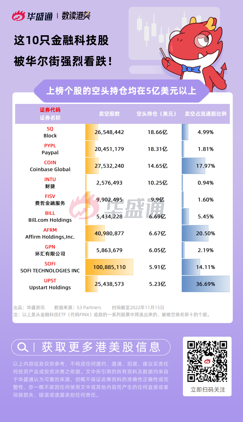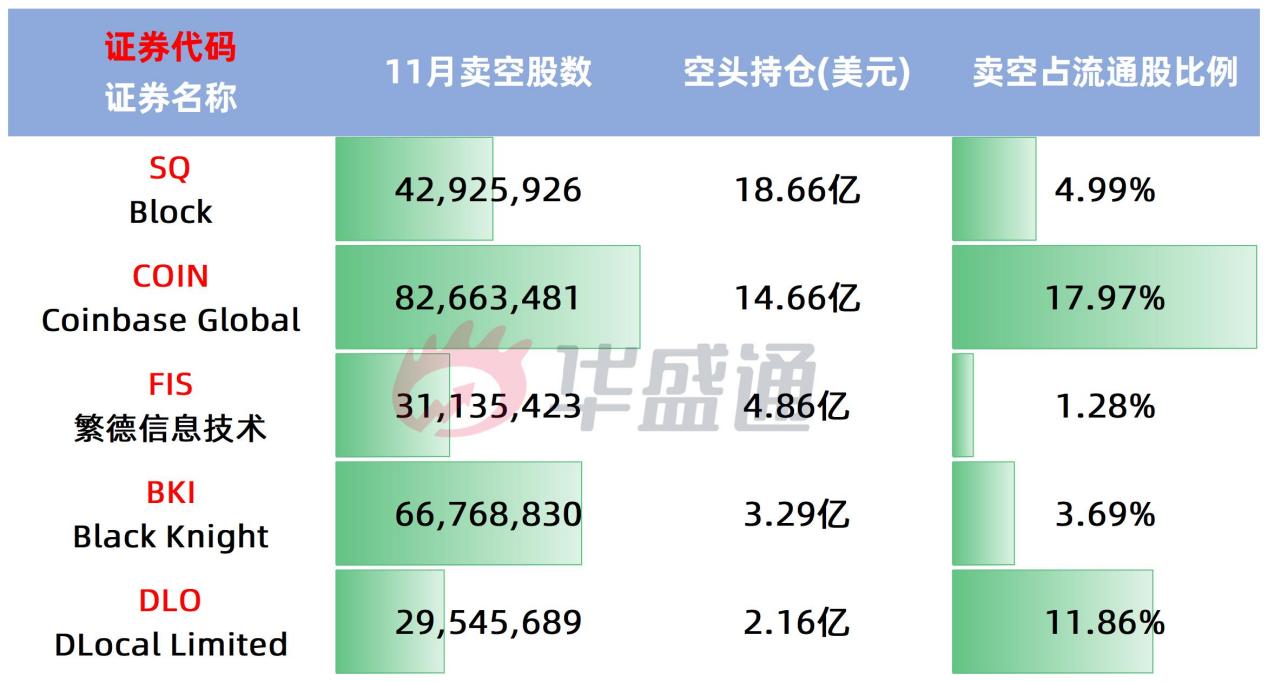 S3 Partners的数据显示,在金融科技ETF $FINX 追踪的股票中,截至11月15日共有152.5亿美元资金做空这一篮子股票,DLocal Limited、Coinbase $COIN 等股在截至11月15日的一个月内的卖空增幅排名居前。