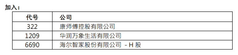 据指数公司公告,恒生指数在本次的调整中,康师傅、华润万象、海尔智家纳入恒生指数。成份股数目成份股数目将由 73 只增加至 76 只。