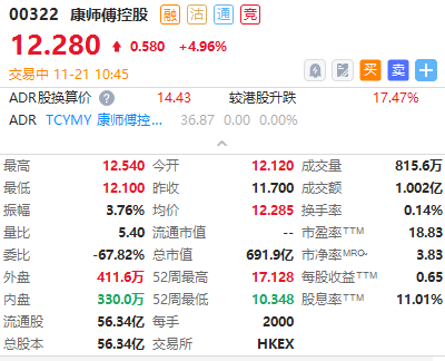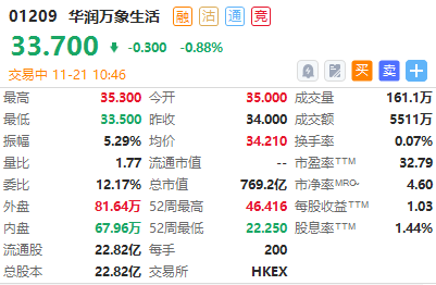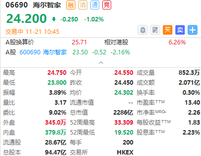 截至发稿,康师傅控股涨近5%,海尔智家、华润万象生活小幅下跌。