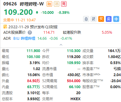 截至发稿,哔哩哔哩港股跌超8%。
