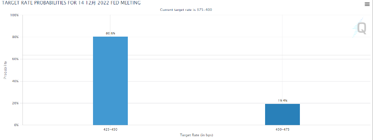 当地时间11月18日,美国圣路易斯联储主席布拉德表示,即使在对货币政策进行“慷慨”分析的情况下,美联储也需要继续加息,并至少要加息至5%-5.25%。同日,明尼阿波利斯联储主席卡什卡利表示,暂时难以预测美联储需要将利率提高至何种水平,但在通胀明显见顶之前不应停止加息。 目前,利率期货数据显示,市场预期美联储12月加息50个基点的概率为80%;预期美联储12月加息75个基点的概率为19.4%。
