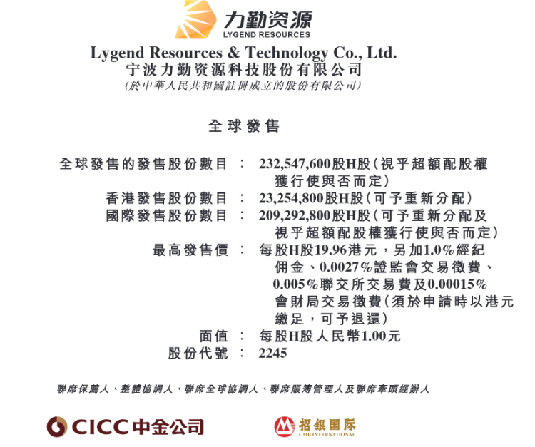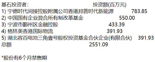基石投资者包括:香港邦普时代新能源有限公司(宁德时代(300750.SZ)的间接控股附属公司);中国国有企业混合所有制改革基金有限公司;宁波市鄞州区金融控股有限公司;格林美香港国际物流有限公司;湖北容百电池三角壹号股权投资基金合伙企业(有限合伙)。
