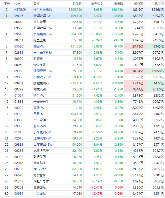 科网股齐挫,哔哩哔哩跌超8%,美团-W跌5.86%,京东集团-SW跌6.06%,阿里巴巴-SW跌超5%;快手-W、网易-S、小米跌逾3%,腾讯控股跌1.81%。