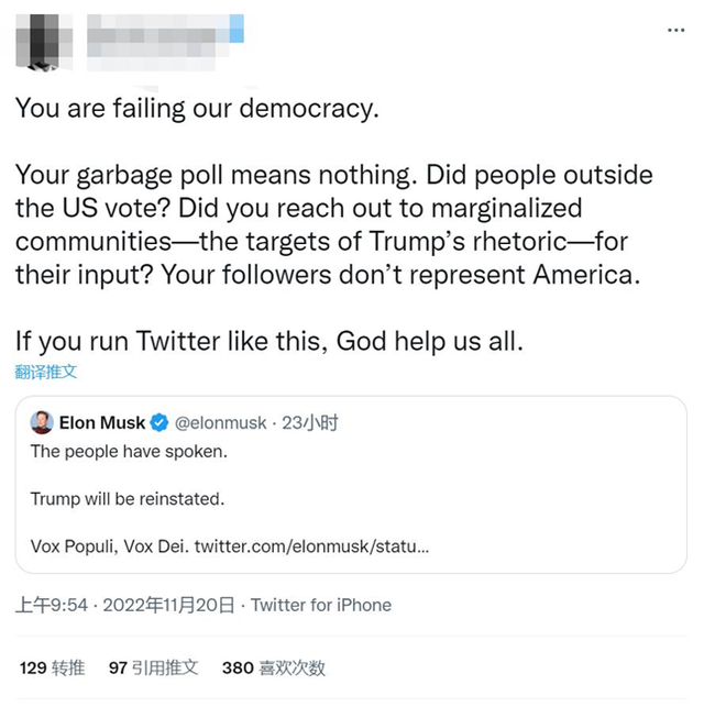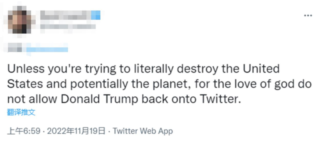 有人代表“全体美国人”致马斯克:没有人希望特朗普出现在推特上。