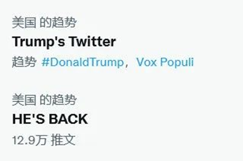 当地时间19日,推特的新老板马斯克决定恢复美国前总统特朗普的推特账号,“他回来了(HE'S BACK)”“特朗普的推特(Trump’s Twitter)”迅速登上推特热榜。
