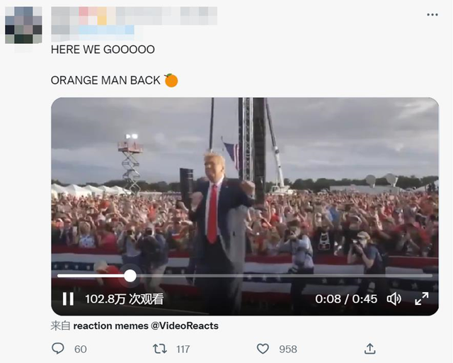 还有网友激动地配上特朗普的视频,称“小橙人回来了(特朗普因看上去是橙色的皮肤广受关注)”