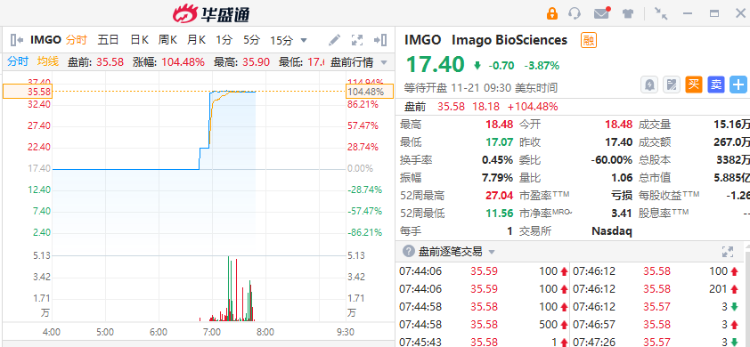 11月21日,市场消息:默沙东将以36美元/股的现金收购Imago Biosciences;该收购交易的总价值约为13.5亿美元,将有助于公司扩大血液学方面的组合;预计该收购交易将在2023年第一季度完成。受此影响,Imago BioSciences盘前直线拉升,截止北京时间20:47,Imago BioSciences涨逾104.48%,报33.58美元。