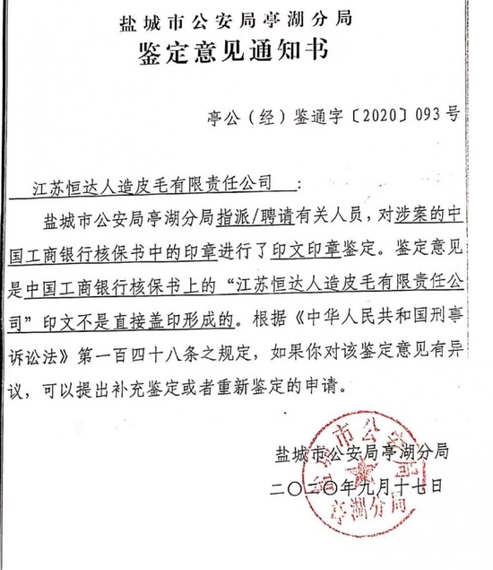 2018年11月,该判决生效。2020年5月和12月,盐城市亭湖区法院先后查封划扣了江苏恒达公司账户的1763.29万元。同年7月,江苏恒达公司已针对公章和法定代表人签名被伪造一事向警方报案。2020年9月17日,盐城市公安局亭湖分局出具鉴定意见称,经对涉案的中国工商银行核保书中的印章进行了印文印章鉴定,鉴定意见是:核保书上“江苏恒达人造皮毛有限公司”印文不是直接盖印形成的。