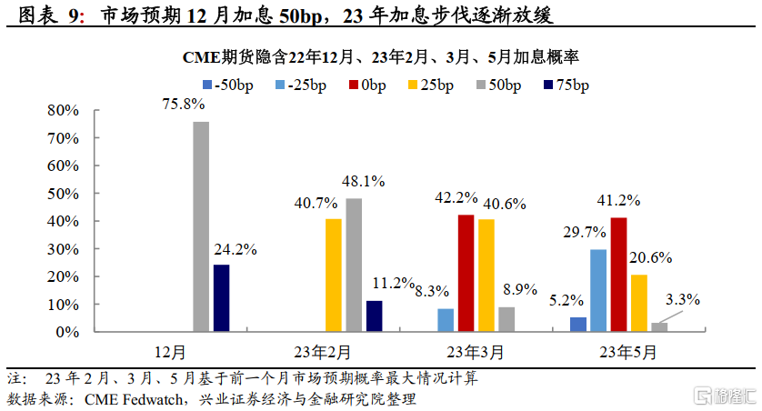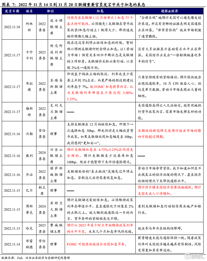 关于加息高度(how high):布拉德推算,即使基于鸽派的假设,本轮加息周期的利率峰值也至少要达到5.00%-5.25%(目前联邦基金利率区间为3.75%-4.00%),而更严格的假设则应高于7%;柯林斯强调美联储仍然存在12月份单次加息75bp的可能性。