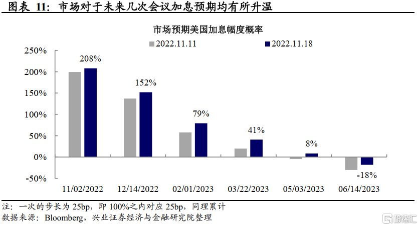 美国10月PPI和CPI数据均低于预期,通胀出现单月缓和征兆,股债双涨;但后续美联储多位官员发表鹰派言论,10年期美债利率再次上行,加息预期有所回温。对此,我们认为: