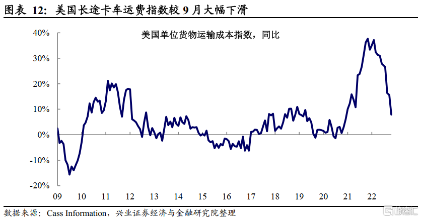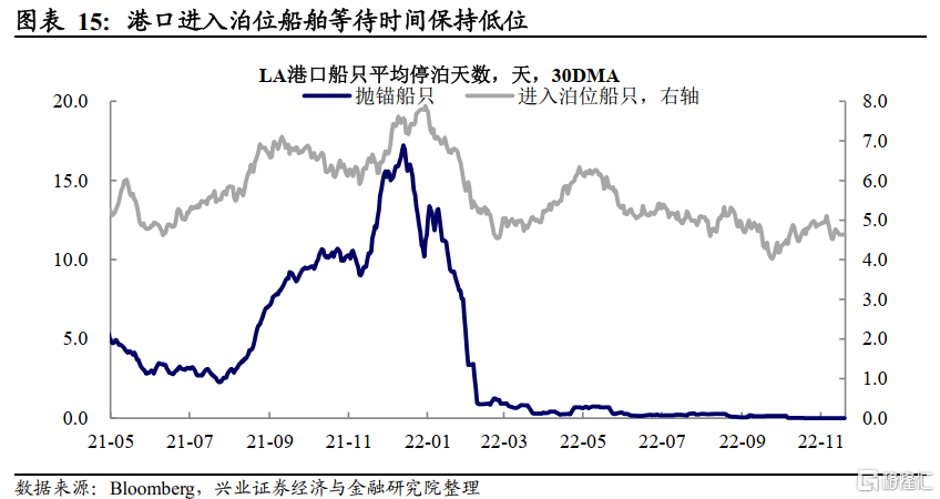 供应链持续缓解:美国长途卡车运费指数、单位货物运输成本在22年下半年持续下行,10月降幅有所扩大;洛杉矶和长滩港在泊位及其外围等待的船只数量从上周10只大幅下降至2只,港口泊位船舶等待时间稳定在低位区间。