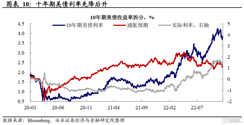 周中多位联储官员接连放鹰,市场情绪冷却,加息预期回升。上周周中以来,联储的鹰派表态让市场加息预期再度回升,期货隐含2023年底联邦基金利率从上周的4.4%回升至4.7%,10年期美债利率上行突破3.8%。