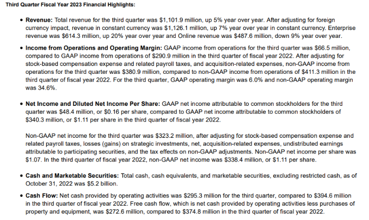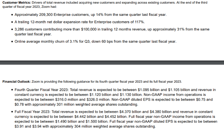 11月22日,视频会议软件开发商Zoom公布了该公司的2023财年第三财季财报。