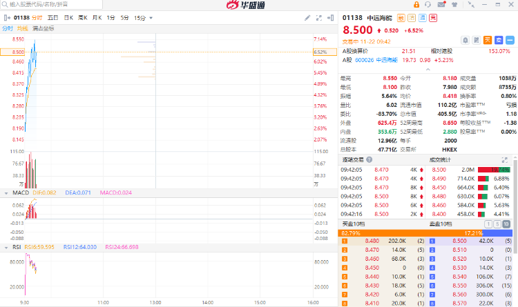 华盛资讯11月22日消息,中远海能早盘再涨超6%,截至发稿,涨6.52%,报8.5港元,成交额8735万港元,月内累计涨幅达48%。