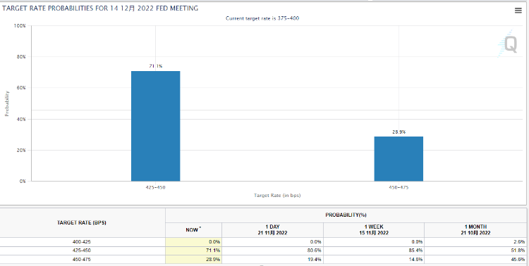 CME利率观测工具显示,12月加息50个基点的概率为71.1%。