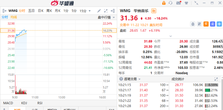 华盛资讯11月22日消息,美股盘中,三大指数高开高走,截止北京时间23:20,道琼斯指数涨0.82%,标普500指数涨0.66%,纳斯达克指数涨0.27%,唱片公司华纳音乐大涨16.24%,报31.36美元,公司2022财年Q4净利润同比暴增4倍至1.5亿美元,远超市场预期。