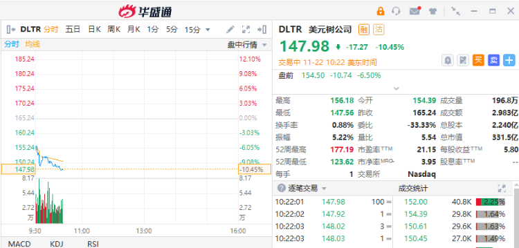 折扣零售巨头美元树公司跌超10.45%,预计全年利润将处于指引区间的低位。