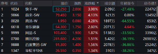 走高涨超1%,快手、蔚来、商汤涨4%,网易、腾讯涨近2%。