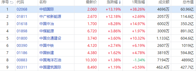 华盛资讯11月23日消息,港股中字头概念股再度走高,中铝国际涨超13%,中国中冶涨8.28%,中国交通建设、中煤能源涨超3%。证监会主席易会满表示,探索建立具有中国特色的估值体系,促进市场资源配置功能更好发挥。