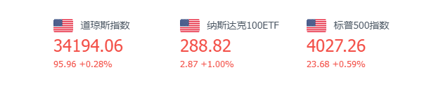 美国三大股指全线收涨,道指涨0.28%报34194.06点,标普500指数涨0.59%报4027.26点,纳指涨0.99%报11285.32点。迪士尼涨2.85%,赛富时涨2.04%,领涨道指。万得美国TAMAMA科技指数涨1.46%,特斯拉涨7.82%,谷歌涨1.45%。中概股多数上涨,玩美涨38.14%,雾芯科技涨18.34%。