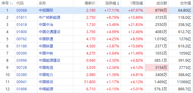 继此前“中字头”股票集体爆发,今日港股中字头再度走高。截至发稿,中铝国际涨超17%,报2.19港元每股;近一周涨幅近48%;中广核新能源涨超8%;中国中冶涨超5%;中国交通建设、中国联通涨超4%;中国铁建、中国能源建设、中国移动跟涨。